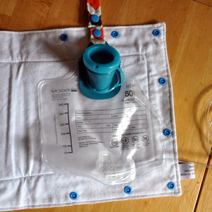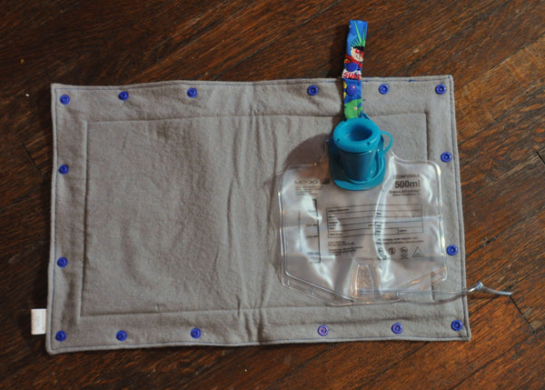 Our Insulated Feeding Pump Bag Covers snap ALL the way around, opening completely flat. This means no need to string the tubing through a small opening in the cover - and it means you can wrap the cover around a bag that's already running. (I know that sounds like a small thing, but it's my favorite part of these covers, and customers consistently return comments like oh, it was sooooo nice to not have to feed the tubing through a hole in the cover!)